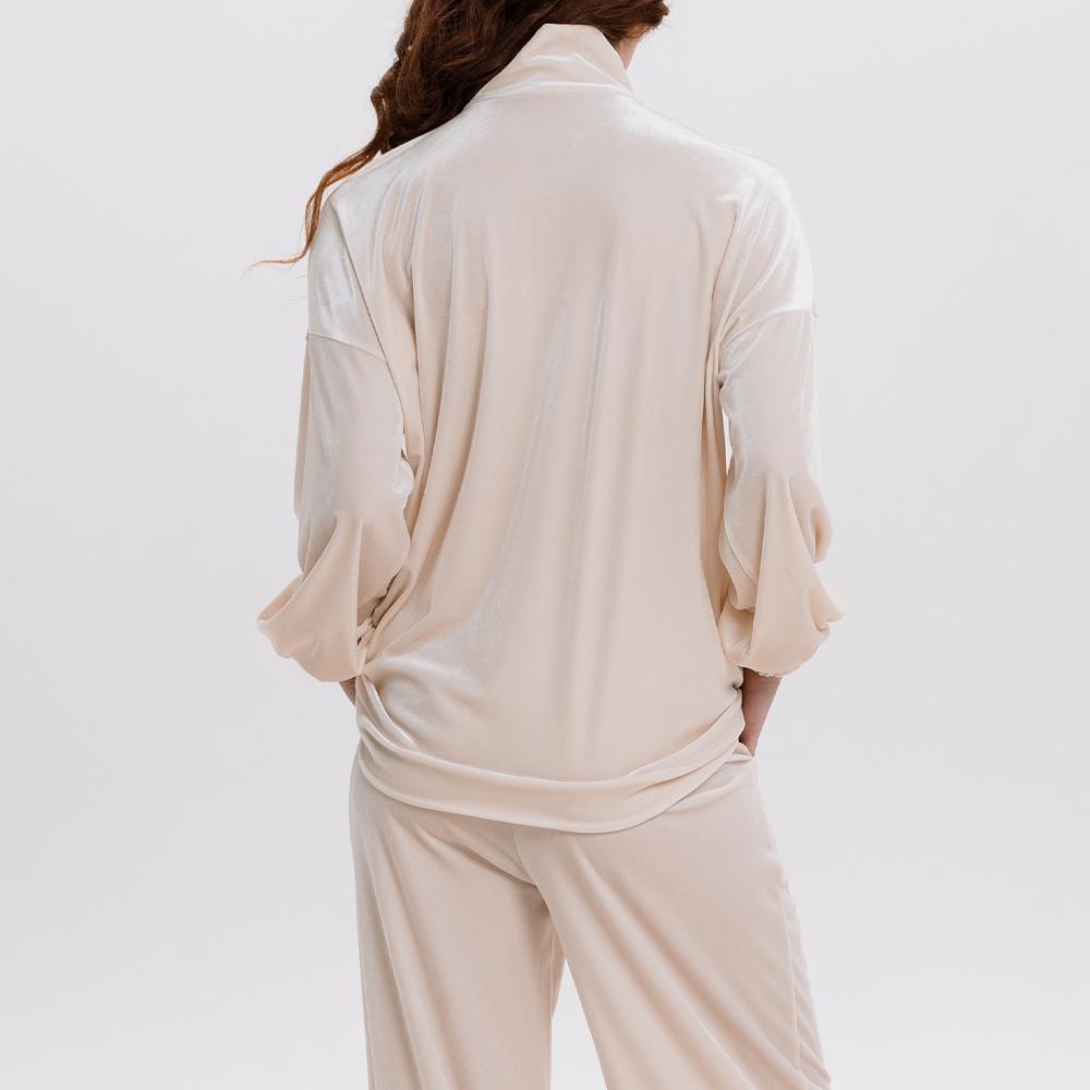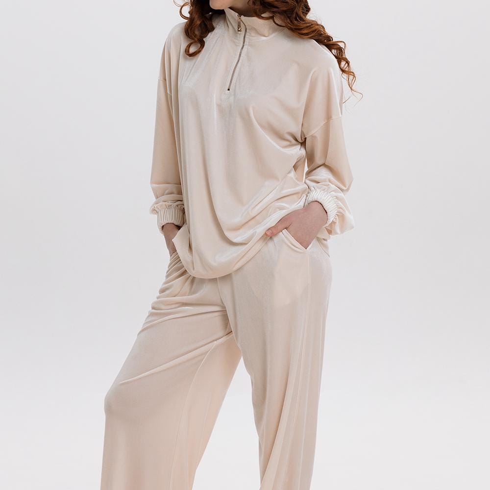 Knitted fabrics with medium density, softness, moderate stretch, and good drape. Recommended types: 2-thread footer, velvet on knitted base, velour on knitted base. The example sweatshirt is made of velvet on knitted base.