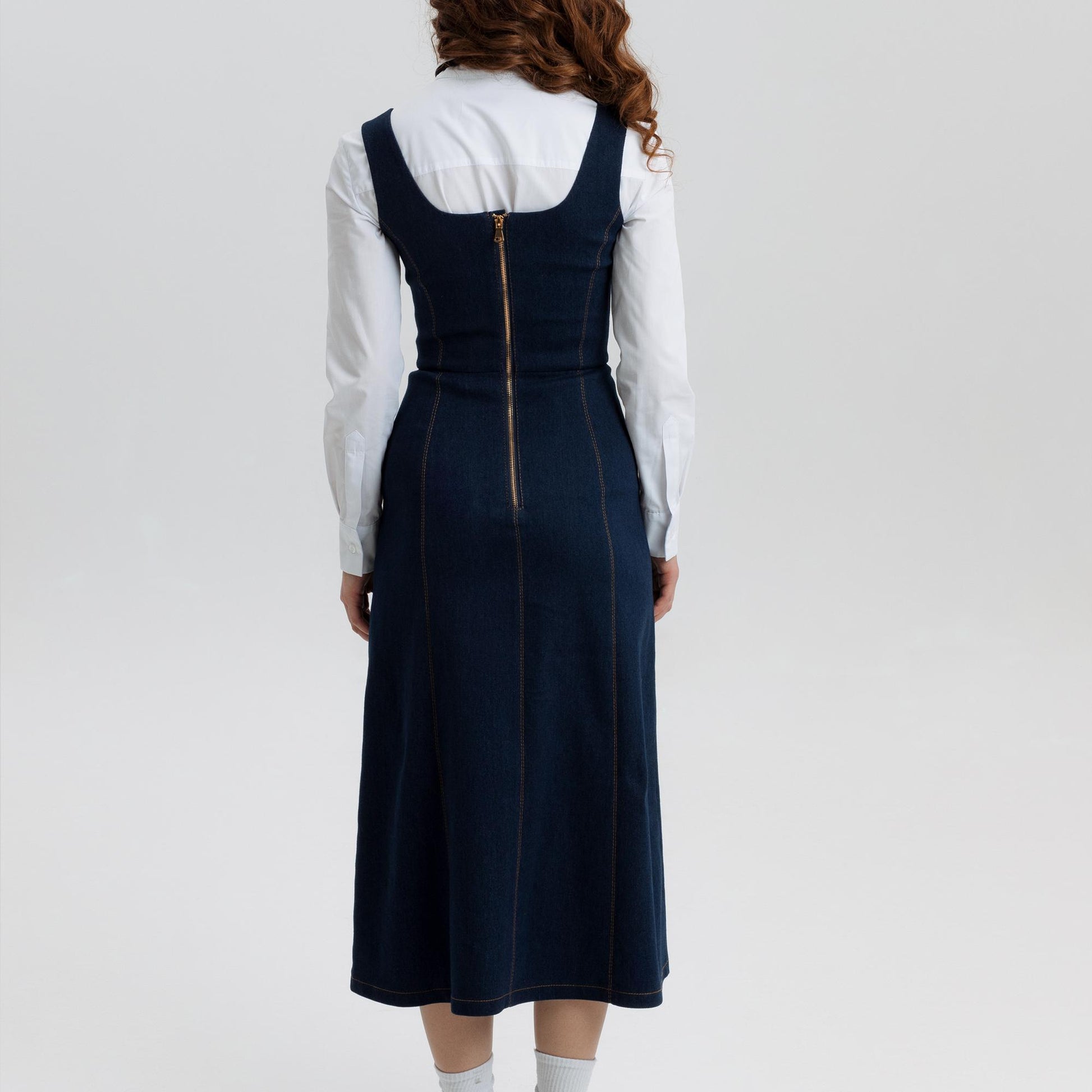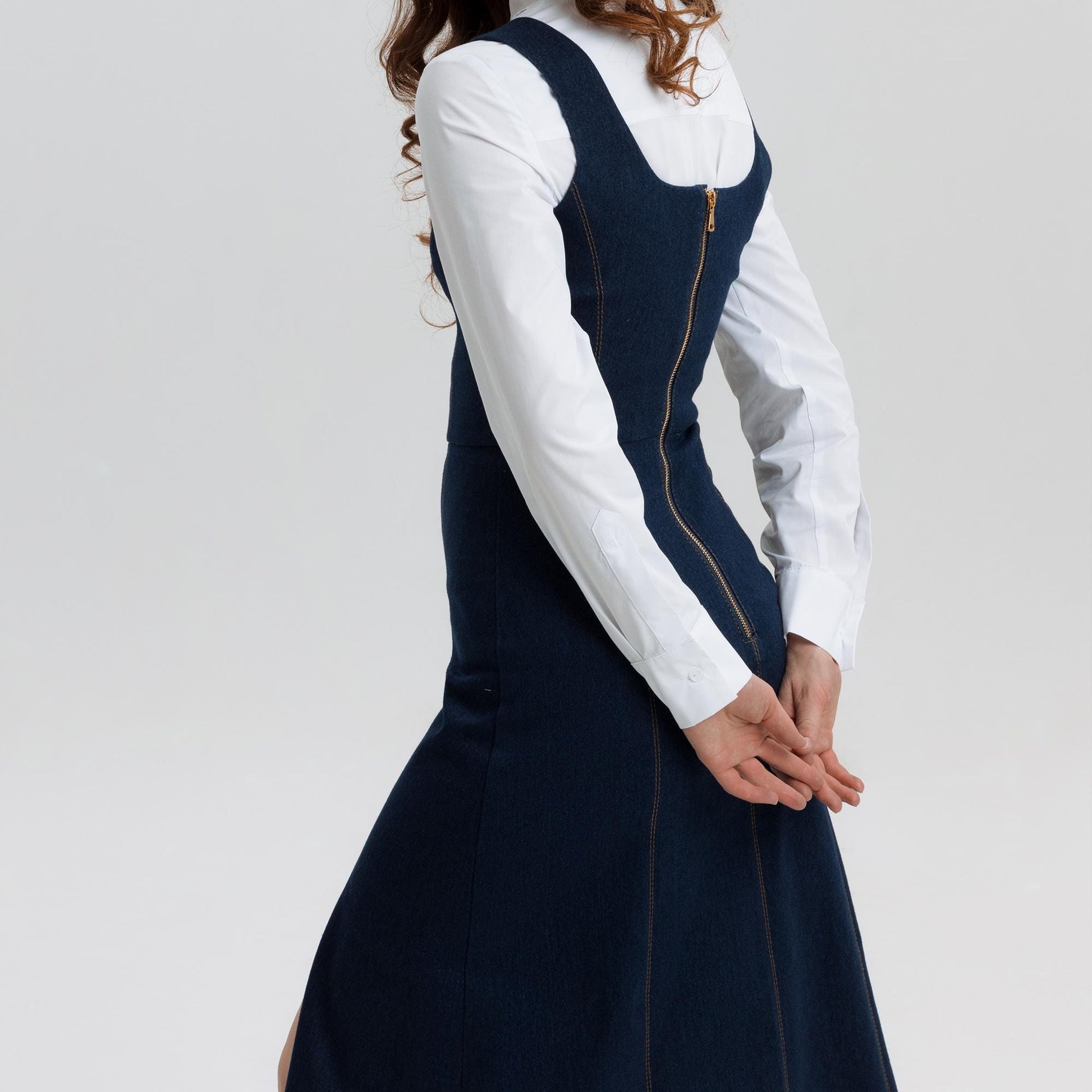 A small-volume, fitted A-line sarafan dress, cut at the waist with a fitted bodice and a skirt that flares toward the hem. Features reliefs on the front and back, a soft square neckline, and high slits in the skirt reliefs. The back has a central metal zipper for fastening. The dress length falls to mid-calf. Bodice is lined for a neat finish, with carefully finished seams and topstitching for durability and style.