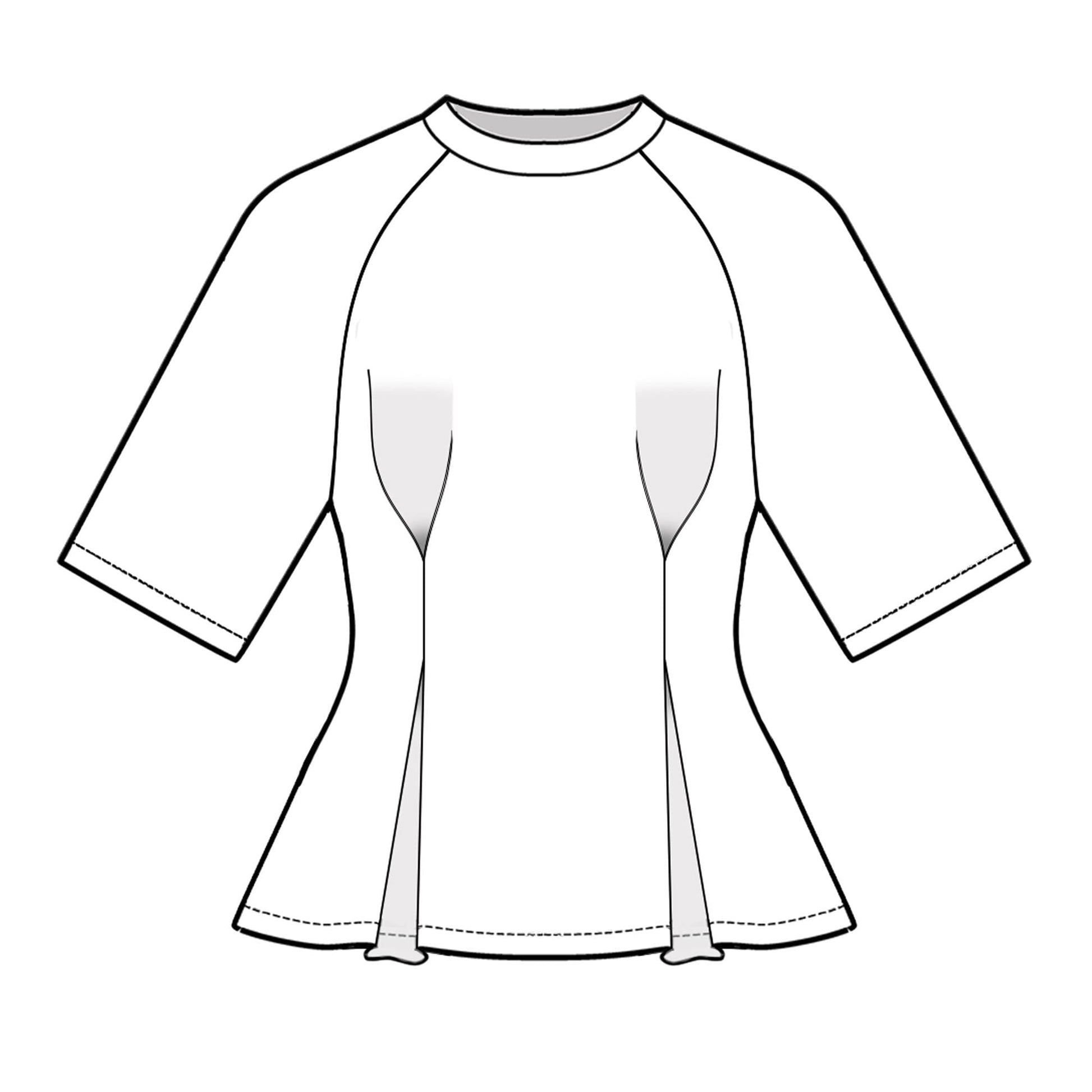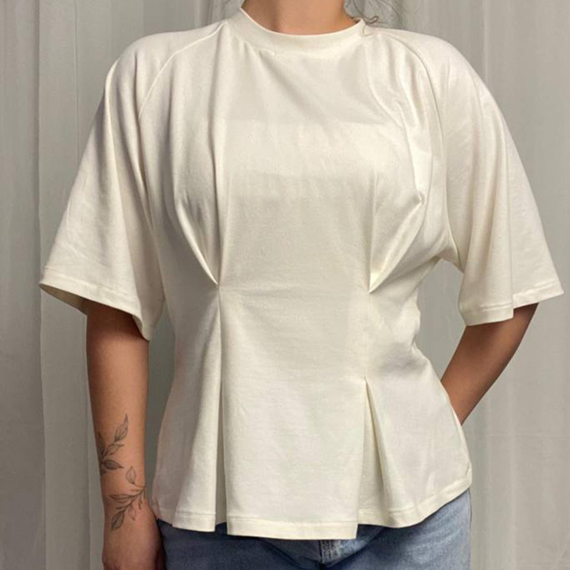 T-shirt of free volume, fitted silhouette, length to the hip line. On the details of the front and back, above the waist level, two pairs of counter-stitched folds