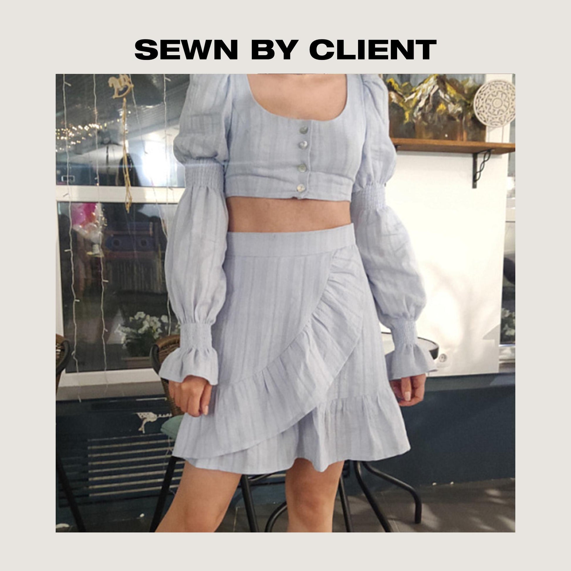 A playful and feminine mini skirt with frills and an adjustable tie belt, perfect for summer outfits. Designed for an easy sew, this skirt combines style with comfort and versatility.