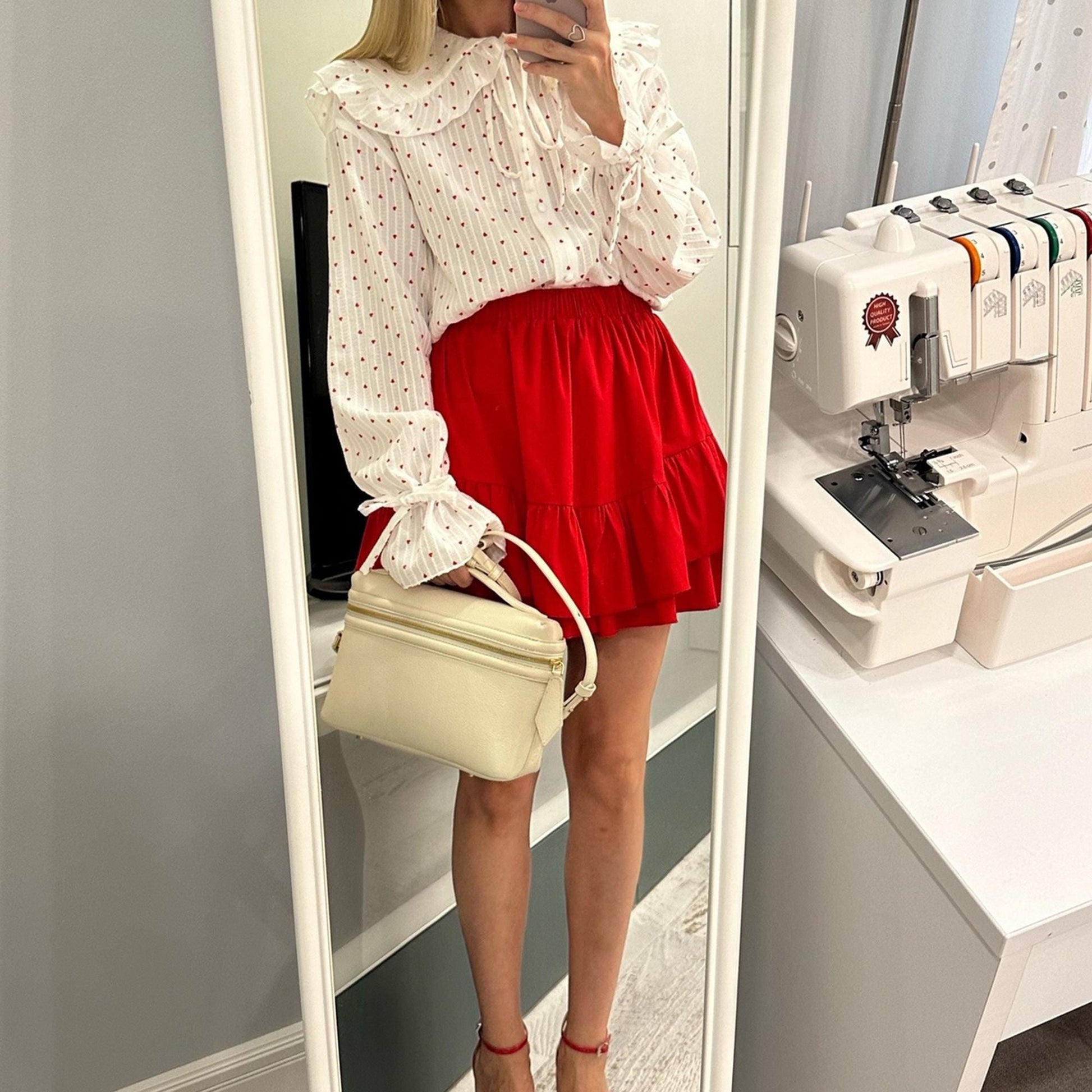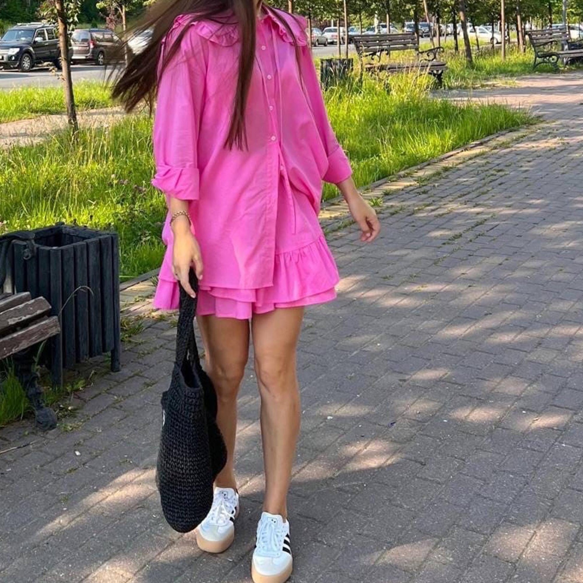 A straight-cut shirt with a classic or ruffle collar and long sleeves. The shirt features a fitted waist, button closure, and detailed finishing along seams, pockets, and belt loops. Perfect for summer or layered outfits, suitable for beginners and more experienced sewists.