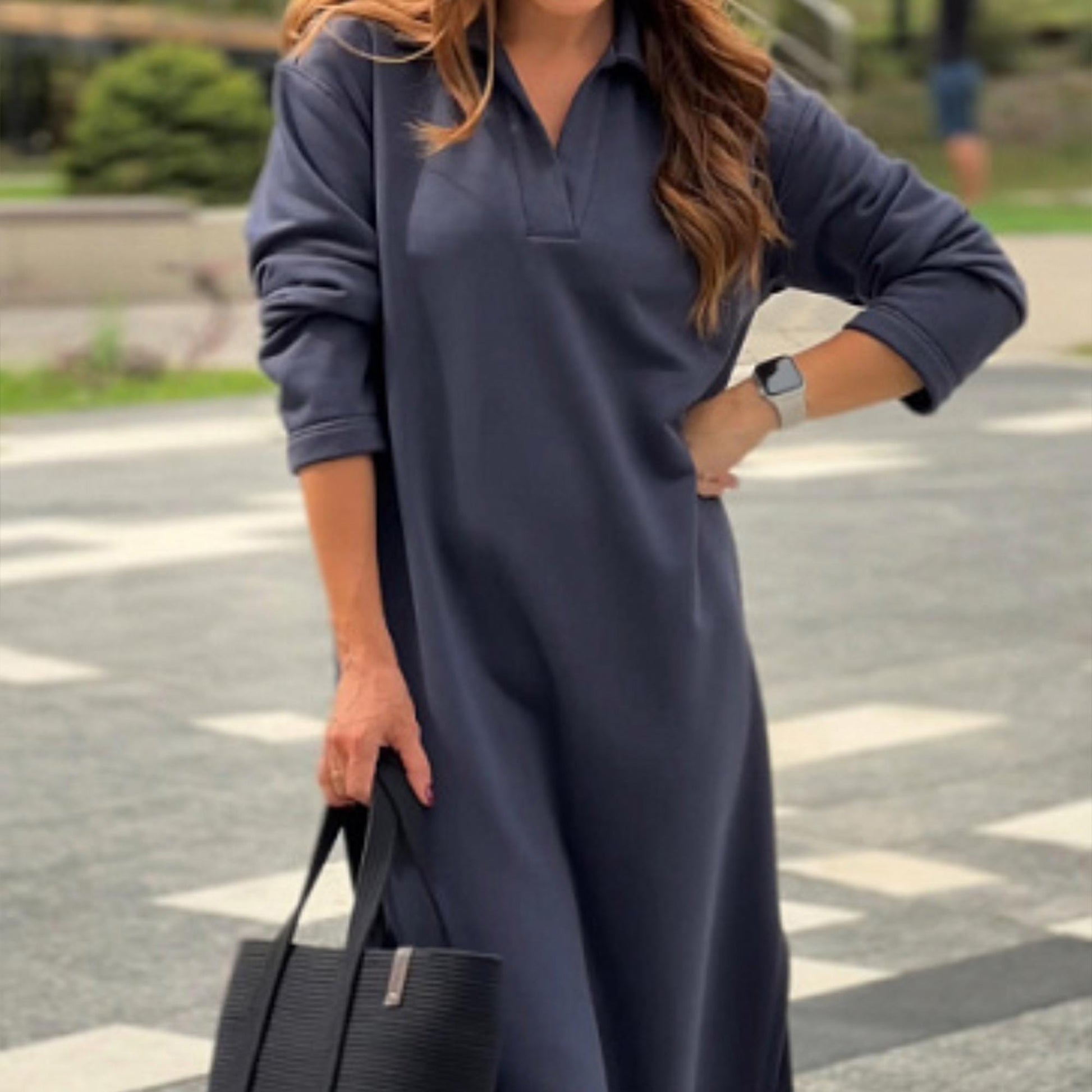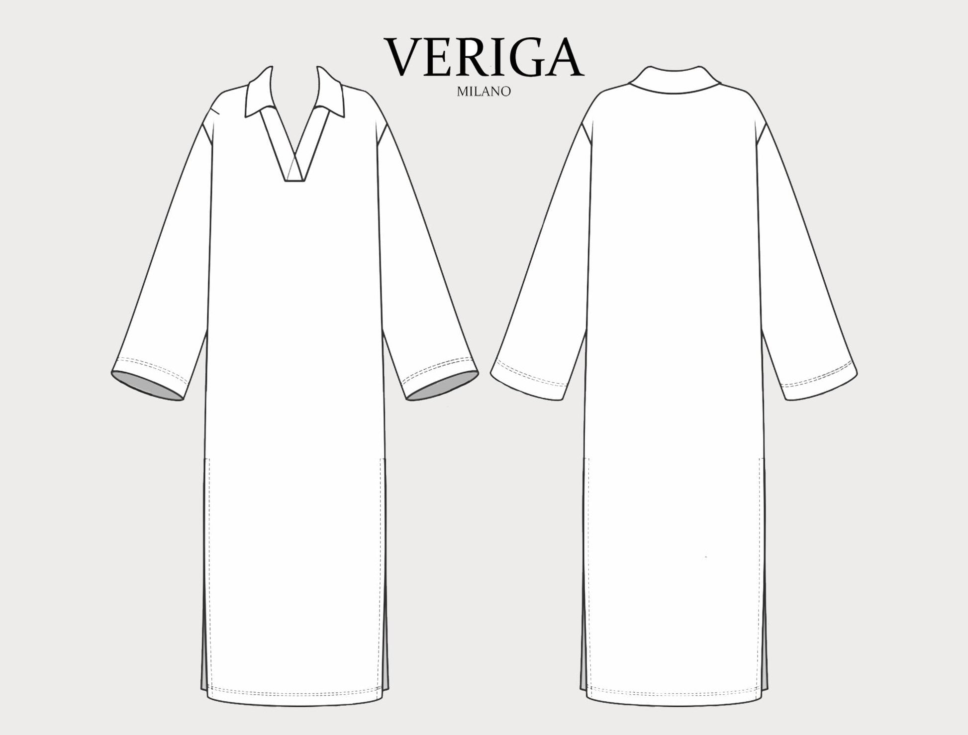 Digital PDF pattern for a straight-cut, loose-fitting Parma Dress with set-in sleeves and dropped armholes. Features a V-neckline with wrap-around strips, a one-piece collar stand, side slits, and a flowing silhouette perfect for outdoor walks, romantic dates, dinners, cocktail parties, or stylish everyday wear. Includes step-by-step sewing instructions.