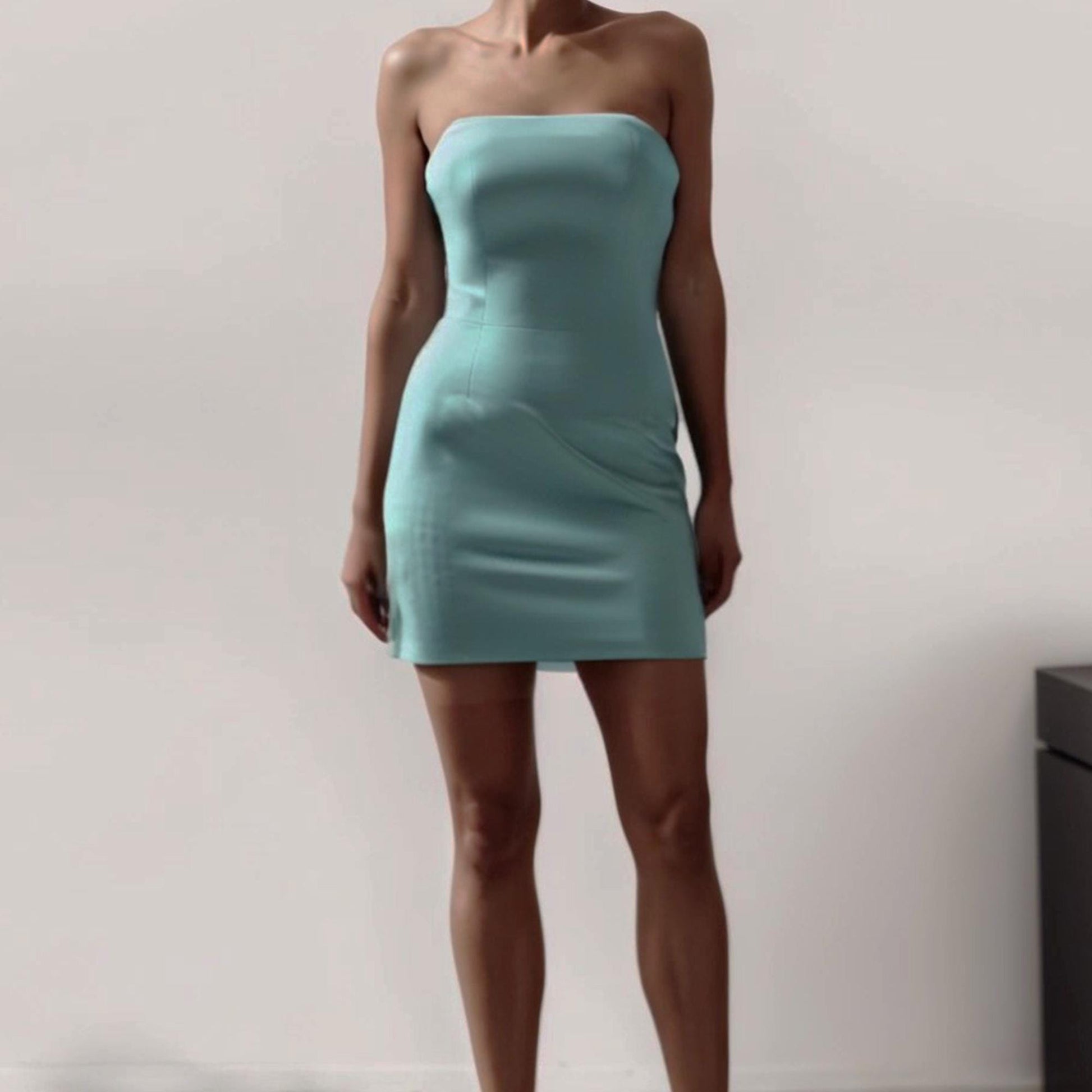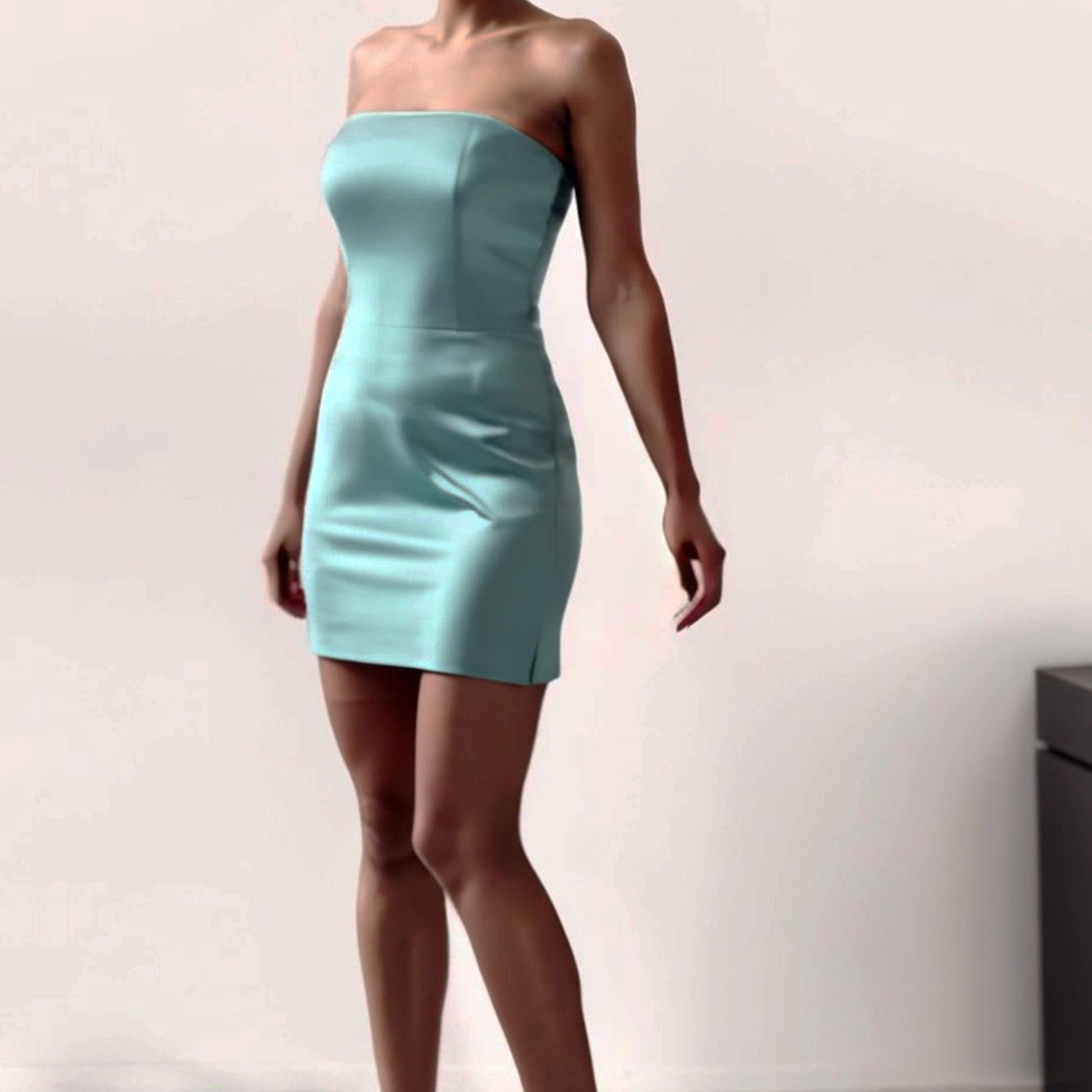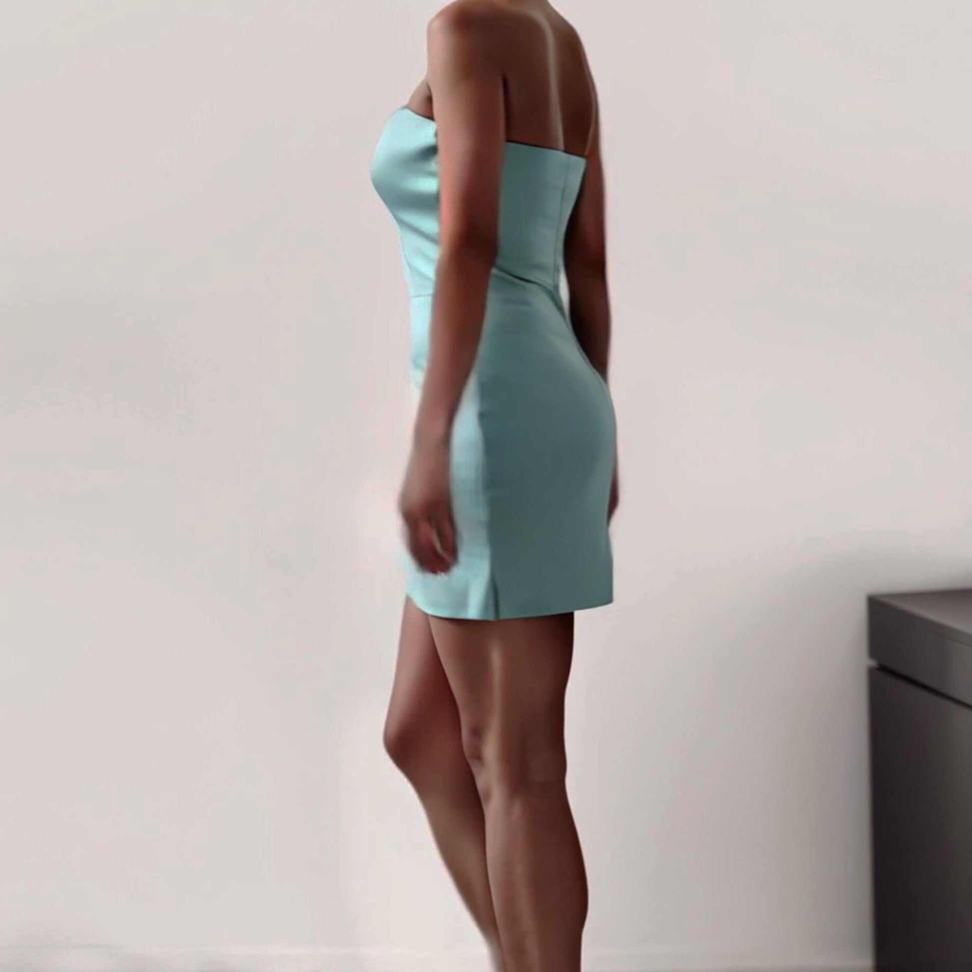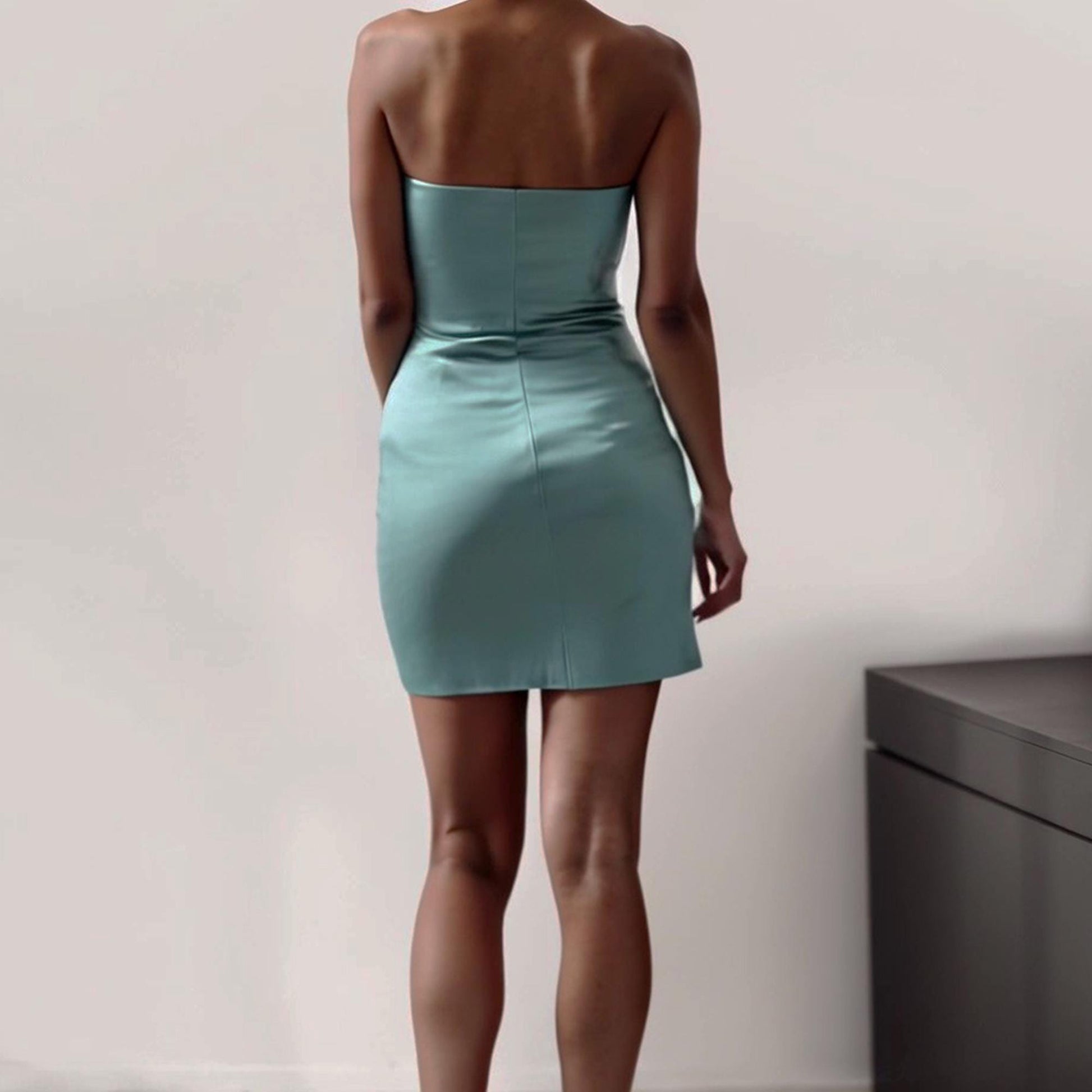 The dress is mini-length, fully lined, and features a zipper in the center back seam.