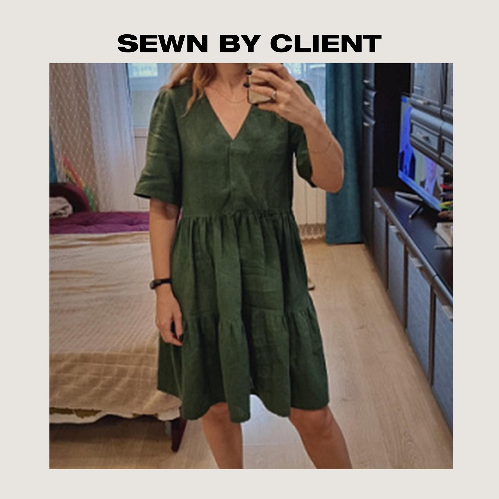 Model details: The dress fastens with loops and buttons on the front. Sleeves are slightly above the elbow, wide, with small gathers along the armhole. The hem of the dress and sleeves is finished with an open cut and 3 cm topstitching. Made from 100% viscose, density 100 g/m². Seam allowances are included.