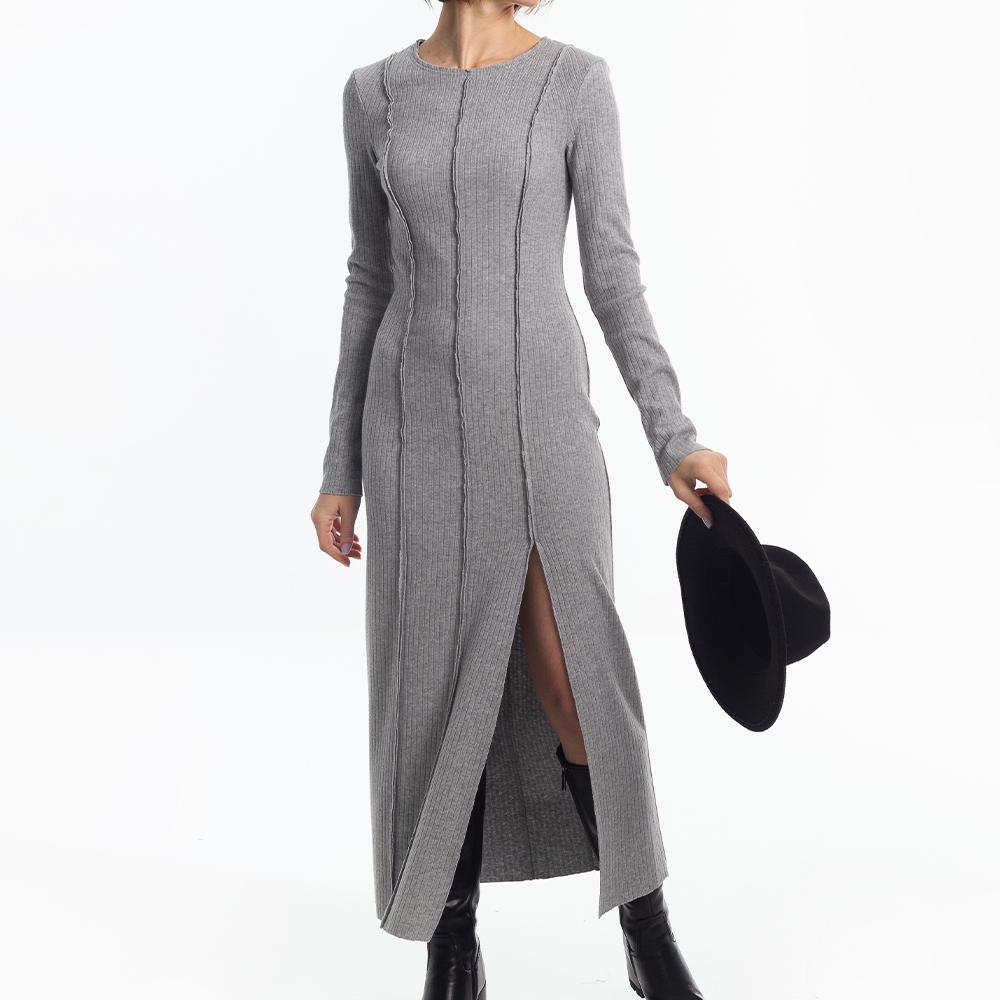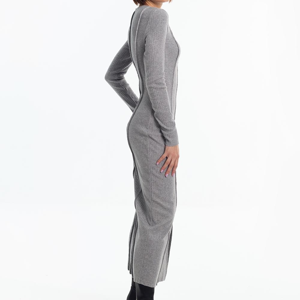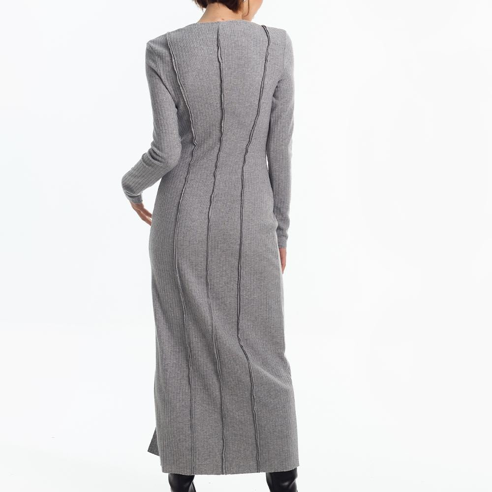Digital PDF pattern for a close-fitting knitted dress, slightly above the ankle. Features shaped vertical reliefs and center seams on the front and back. The seam allowances for reliefs and center seams are directed to the front side and left unprocessed. A slit is included in the left front relief. The neckline is rounded and finished with a facing with open cuts. Sleeves are set-in, long, and of small volume. Edges of the neckline, slit, hem, and sleeve bottoms are unprocessed.
