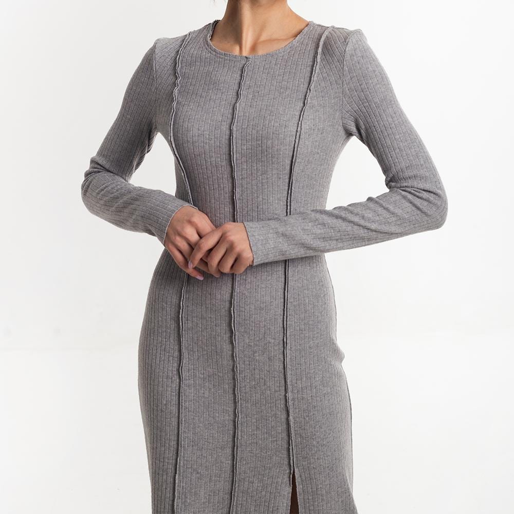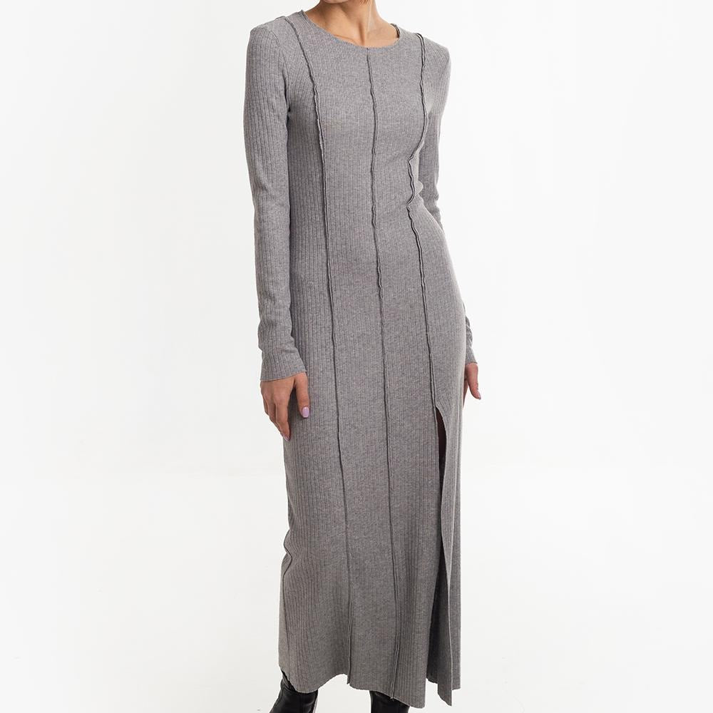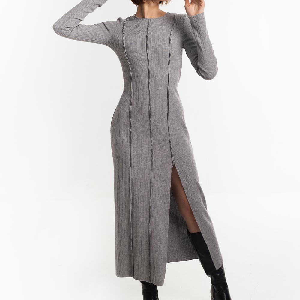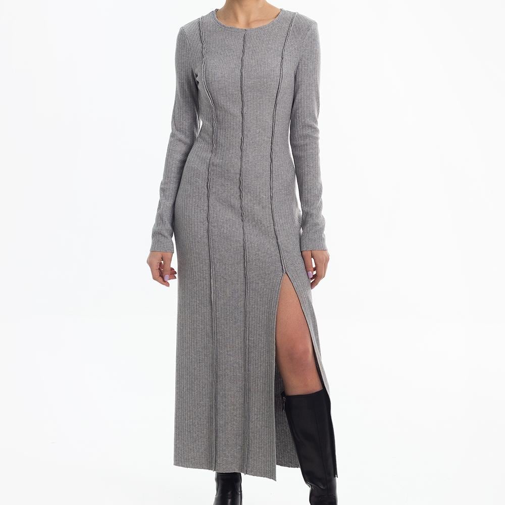 Digital PDF pattern for a close-fitting knitted dress, slightly above the ankle. Features shaped vertical reliefs and center seams on the front and back. The seam allowances for reliefs and center seams are directed to the front side and left unprocessed. A slit is included in the left front relief. The neckline is rounded and finished with a facing with open cuts. Sleeves are set-in, long, and of small volume. Edges of the neckline, slit, hem, and sleeve bottoms are unprocessed.