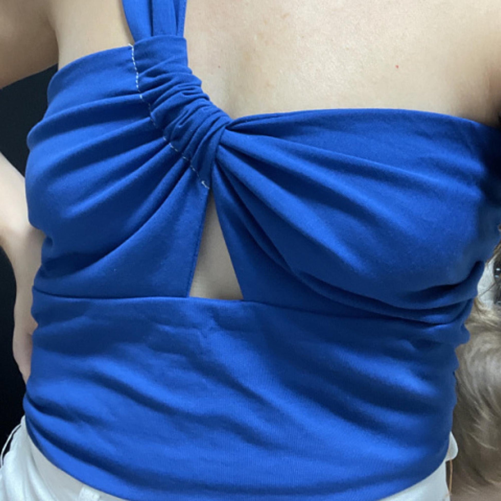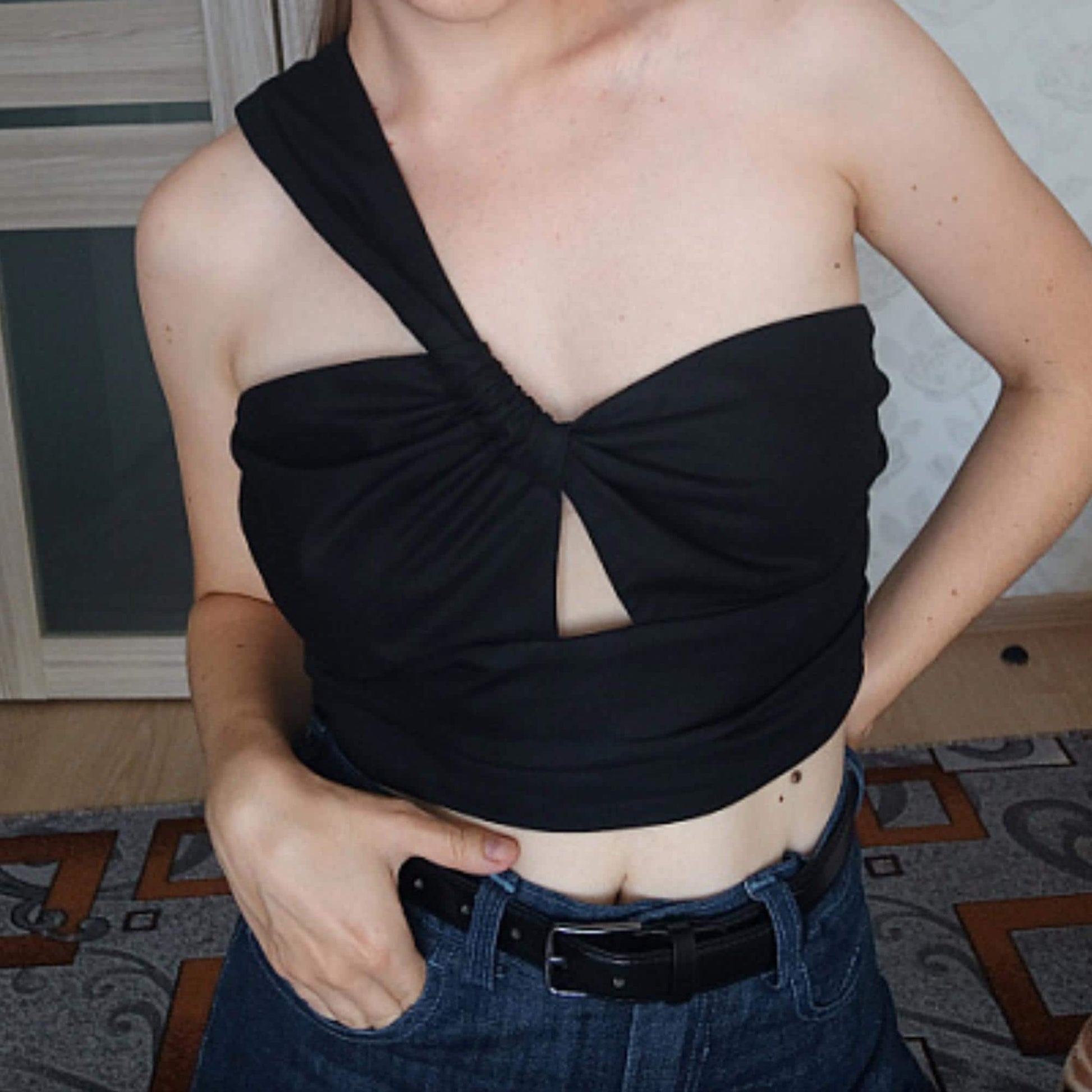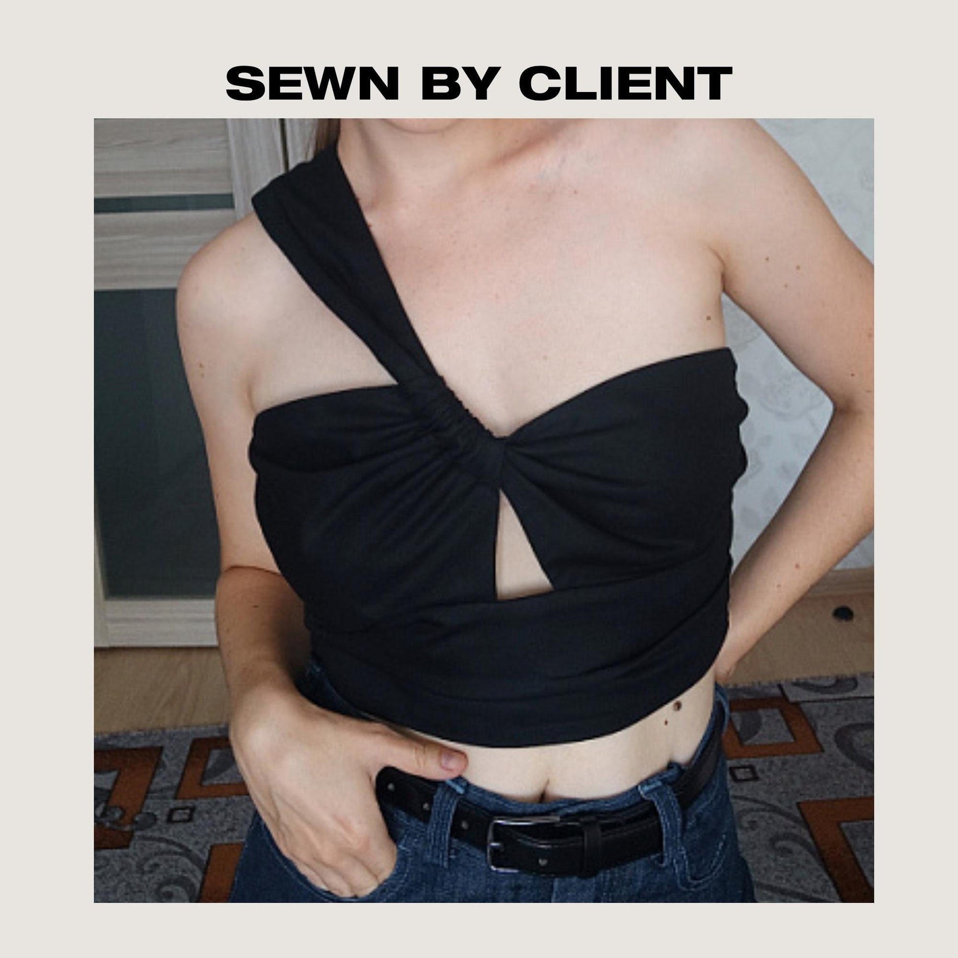 Asymmetrical fitted top, waist length, with a cut-off front bodice gathered at the side seam. The right part of the bodice forms a strap that threads through a drawstring on the left side and fastens at the back. The bottom of the top is gathered, and a concealed zipper is inserted in the side seam. Fully lined in the main fabric.