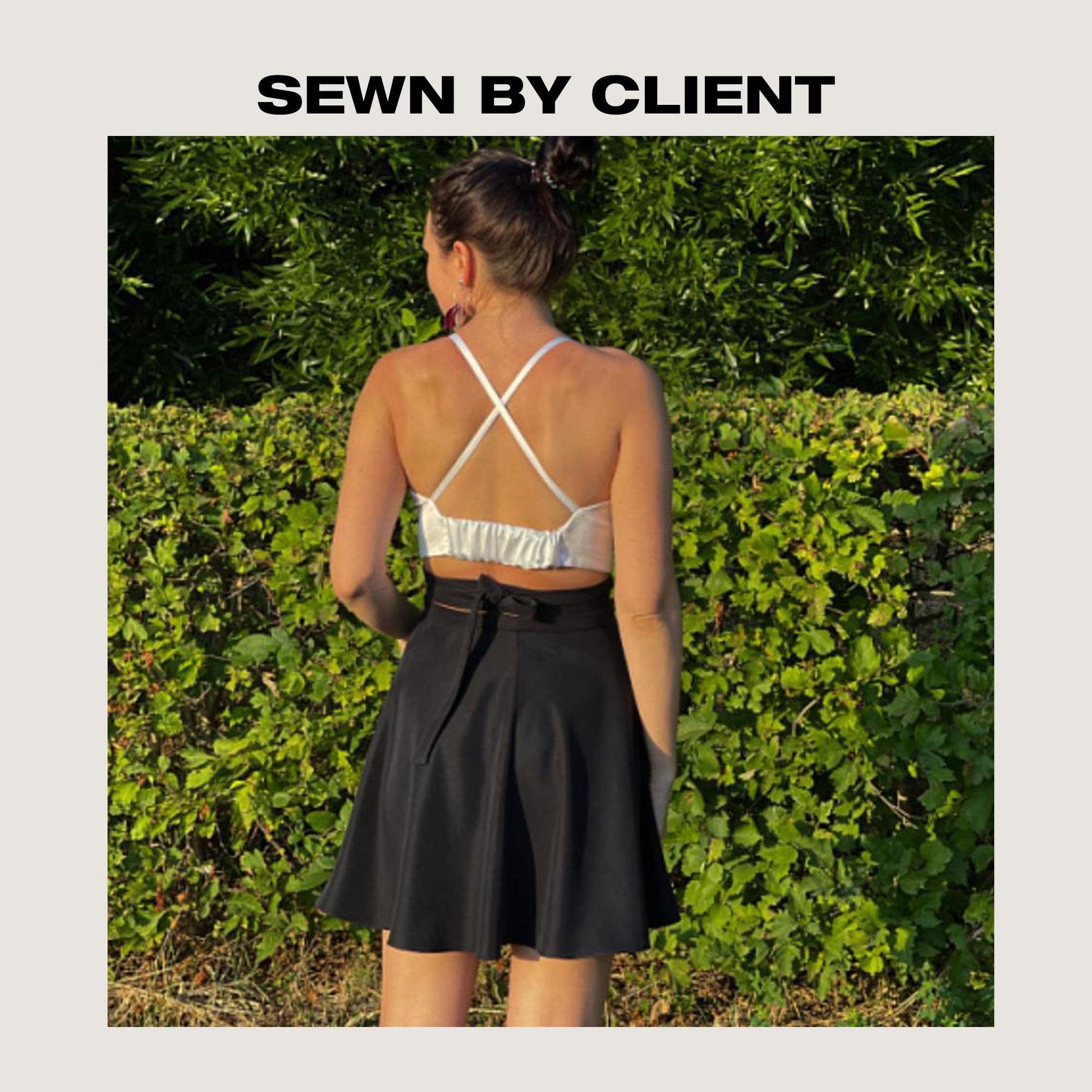 A fitted crop top made of suiting fabric. The front of the top has relief seams, the back has an elastic band and crossed straps. The top is made of shirt cotton, composition: 95% cotton, 5% elastane, density 150 g/m².
